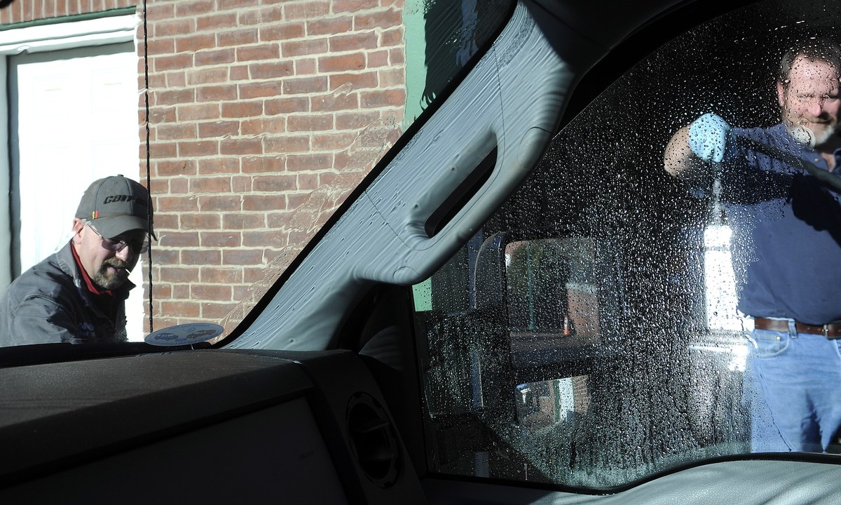Gardiner Water District employees wash their work vehicles Monday.