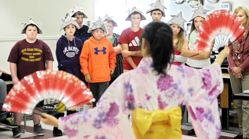 Richmond Middle School students watch exchange student Satoko Suwanai, 16, perform a traditional Japanese dance Tuesday at the school in Richmond. The school hosted 10 teenagers and four chaperones participating in the annual exchange with Hall-Dale High School. Richmond students learned about Japanese origami, music and tea ceremonies in addition to dance. Richmond schools began teaching Japanese last year, according to principal Steve Lavoie.