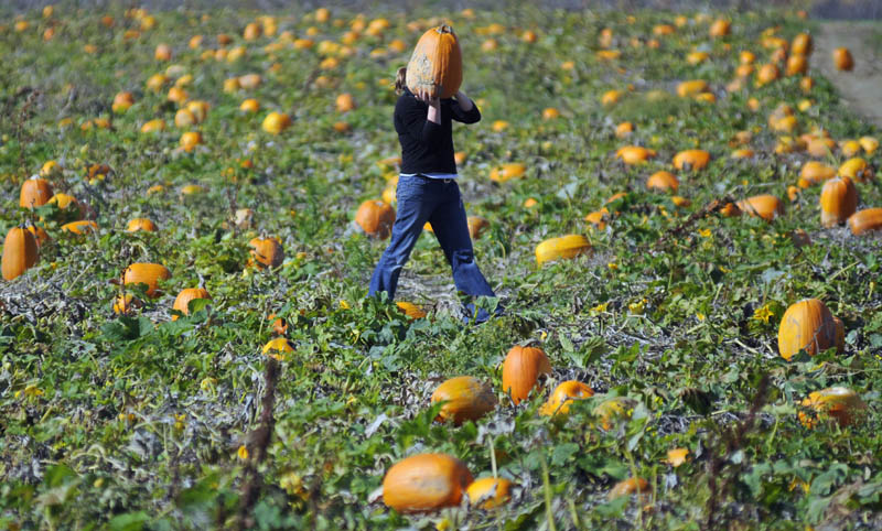 Mary Hastings, of Chesterville, carries a pumpkin from the self pick patch at the Stevenson Farm Thursday in Wayne. Hastings collected 12 pumpkins with four generations of her family at the patch, which will be open for self selection every weekend through Halloween.
