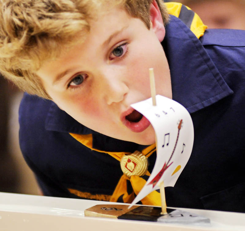 Wolf Scout Ben Nathan, 7, of Hallowell blows his sailboat Thursday during Raingutter Regatta that Cub Scout Pack 647 held in Farmingdale.