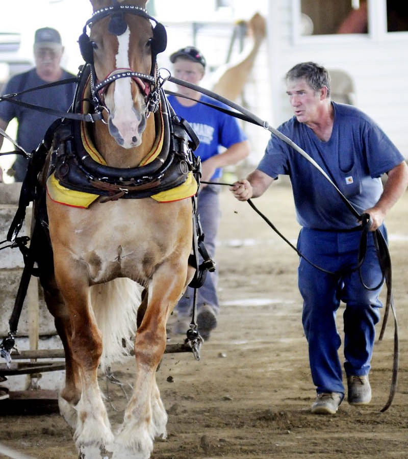 Gordon Libby, right, of Jefferson, guides his team of Belgians Sunday at the annual spring pull of the Maine Draft Horse and Ox Association, hosted at the Windsor Fairgrounds.
