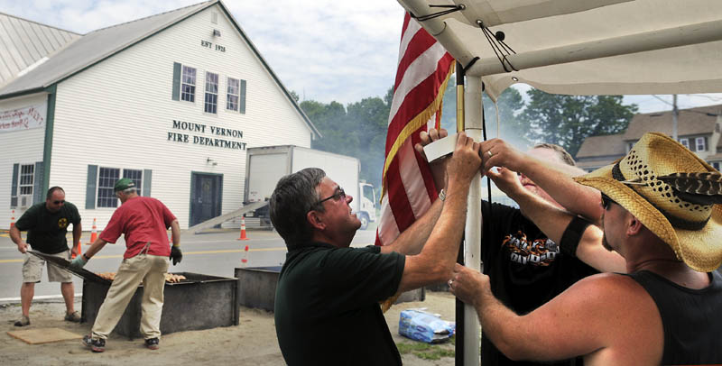 Mount Vernon firefighters John Dearborn, right, Doug Stevens and Dana Dunn hang an American flag Sunday while other volunteers flip racks of chicken barbecuing in scorching heat for the department’s annual chicken barbecue in the center of the village.