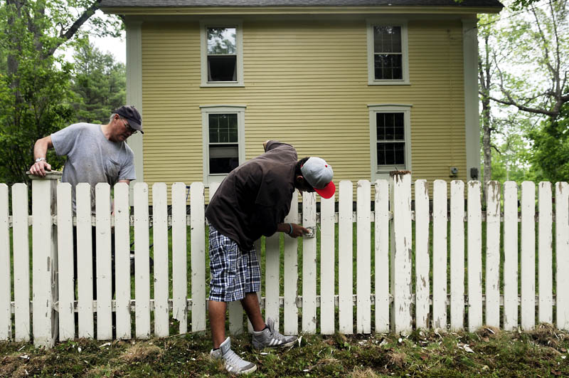 Doug Rooks, left, and his son, Emlyn Rooks-Hughes, scrape down the picket fence at their West Gardiner home on Monday.