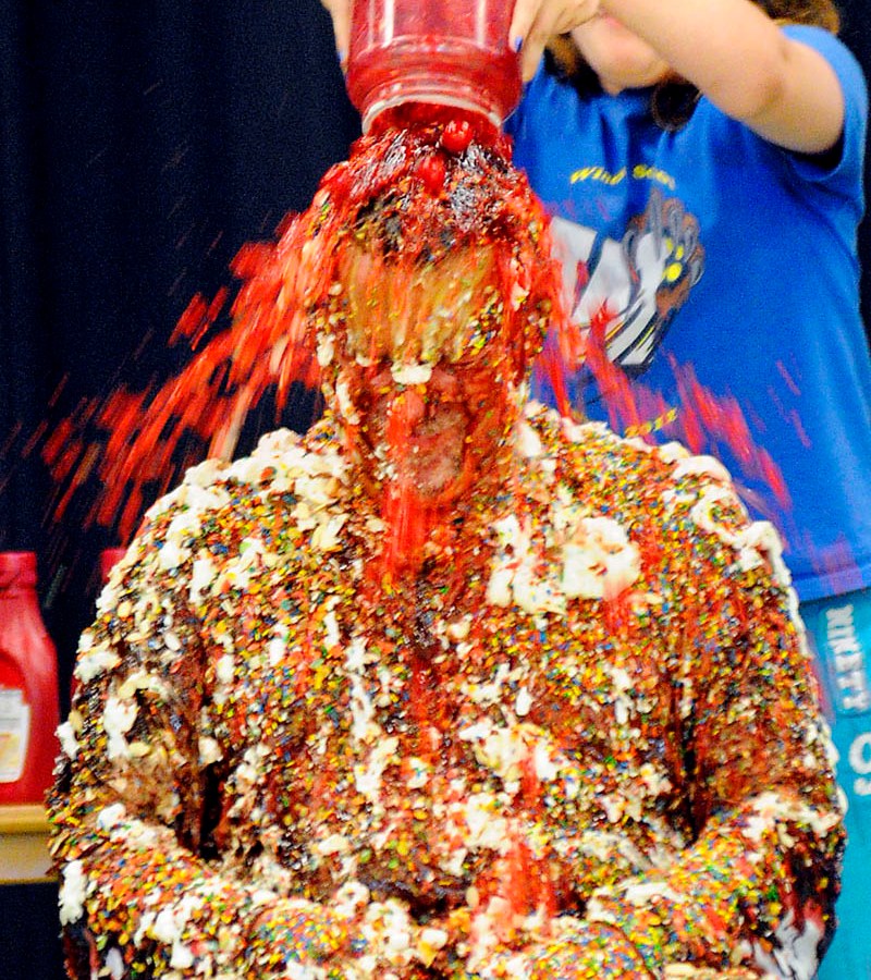 Windsor Elementary School fourth-grader Sydni Plummer dumps cherries on the head of principal Rob Moody on Tuesday, during a celebration at the school in which students and faculty turned Moody into a human sundae.