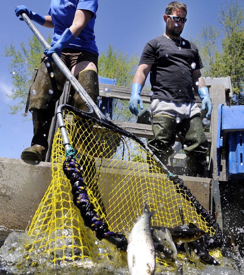 Nicole Brann dips alewives May 15 at the headwaters of Seven Mile Stream at Webber Pond in Vassalboro, as Corey Cookson watches. The duo were harvesting the migrating fish for Ron Weeks, who holds the contract from the town of Vassalboro to sell alewife to lobster fisherman. Three dips filled a crate that weighed about 250 pounds, Cookson said, and held about 500 alewives.