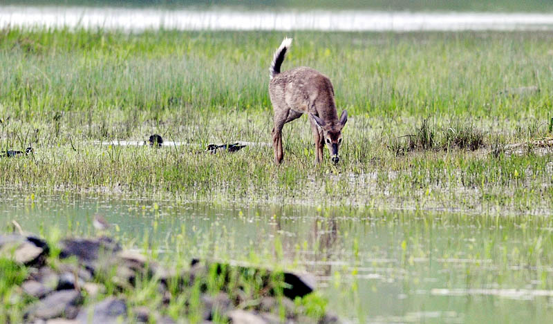 A Whitetail deer grazes on the banks of the Kennebec River Wednesday in Hallowell.