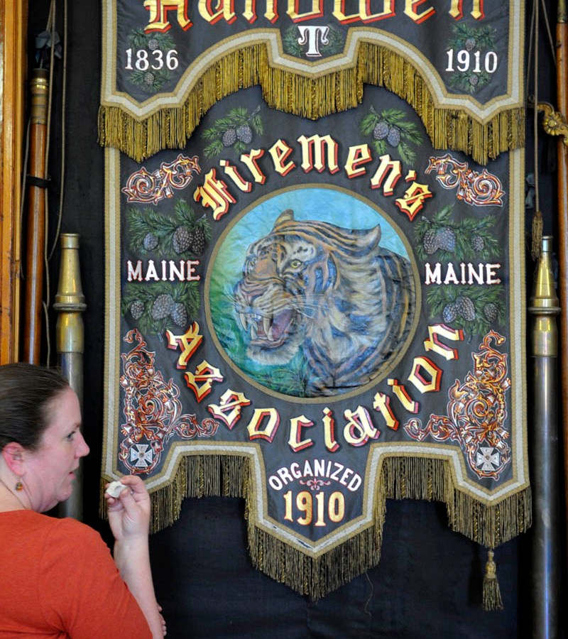 Camille Myers Breeze inspects a smudge sample from the painted silk banner hanging at the Hallowell Fire Department on Wednesday. Breeze, of Museum Textile Services of Andover, MA, assessed the condition of the banner that is believed to date from 1910 to determine its condition and work warranted to restore it. The banner was carried during processions at musters by the Hallowell Firemen’s Association “It’s one of the nicest painted silk banners I’ve ever seen,” Myers Breeze said. The tiger depicted in the banner was the name of the department’s engine at the turn of the 20th century.