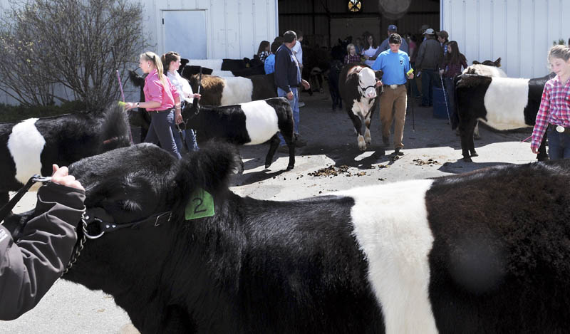 Exhibitors wait to show Belted Galloway cattle Sunday during the youth beef show at the Northeast Livestock Expo, held at the Windsor Fairgrounds. Several hundred children and teenagers attended the weekend event to learn about the welfare of livestock, attend classes and show critters.
