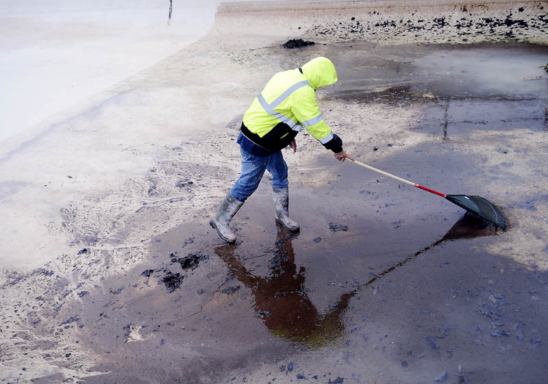 Augusta Parks, Cemeteries and Trees employee Gus Gosselin rakes the bottom of the Calumet Playground pool Tuesday in Augusta, clearing debris that collected during the winter. City crews are prepping three pools for swimmers when school is released this summer.