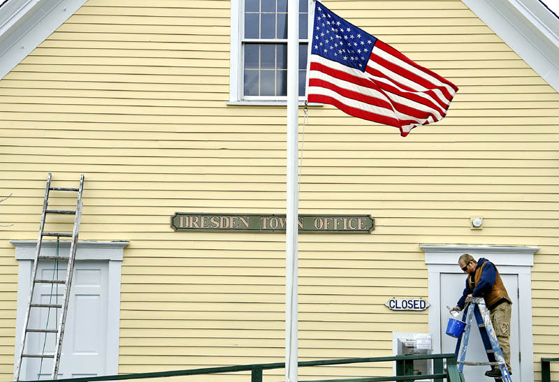 Joe McKenna touches up his brush Thursday while applying a coat of paint to the exterior trim of the Dresden Town Office. A crew from Tom’s Painting Service has applied a new coat to the exterior of the former, one-room school that was “built way back,” according to Dresden town administrative assistant Trudy Foss.