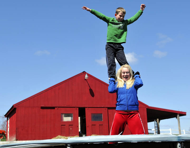 Anna Kulinski, 14, lets go of her brother, Jason, 9, while practicing acrobatics Sunday on the trampoline behind their Monmouth farmhouse. The siblings were practicing flips and landings that the elder Kulinski performs on the Monmouth Academy cheering squad.