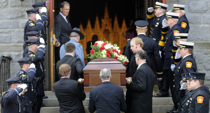 Gardiner police, left, and firefighters salute as the remains of William MacDonald are carried into funeral services Tuesday at St. Joseph’s Catholic Church in Gardiner. MacDonald was Gardiner’s commissioner of public safety, a joint of position of police and fire chief, from 1959 to 1979, then was elected mayor in the early 1980s. MacDonald died Wednesday in Gardiner, where he was born 88 years ago. He is survived by his wife of 60 years, Christine MacDonald, and several generations of children and grandchildren.