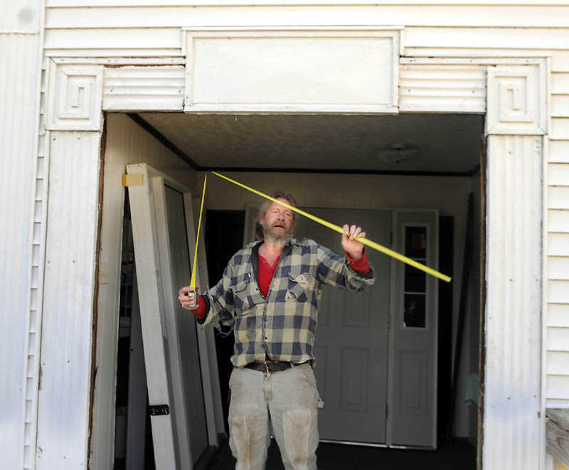 Frank Smith of New Sharon Monday measures the opening for new doors he planned to hang at the entrance of the Vienna Baptist Church. Organized in 1820 and erected in 1840, the church has served the community for over 150 years.