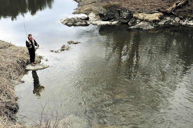Wyatt Rush, 18, of Farmingdale, casts a nymph Thursday in a Hallowell stream while learning to fly fish as part of his senior project at Hall-Dale High School. Rush said he had to study the history of fishing, the science of tying flies and practice casting with the hope of catching a few trout. “I’m still pretty new to this,” Rush said while roll casting his line.