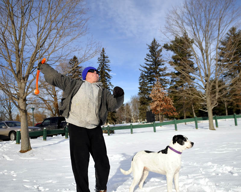 Jerry Ashlock, of Augusta, hurls a ball for his dogs on Thursday, in Augusta. Ashlock said his pair of rescue dogs need to “run around every day” to keep fit.