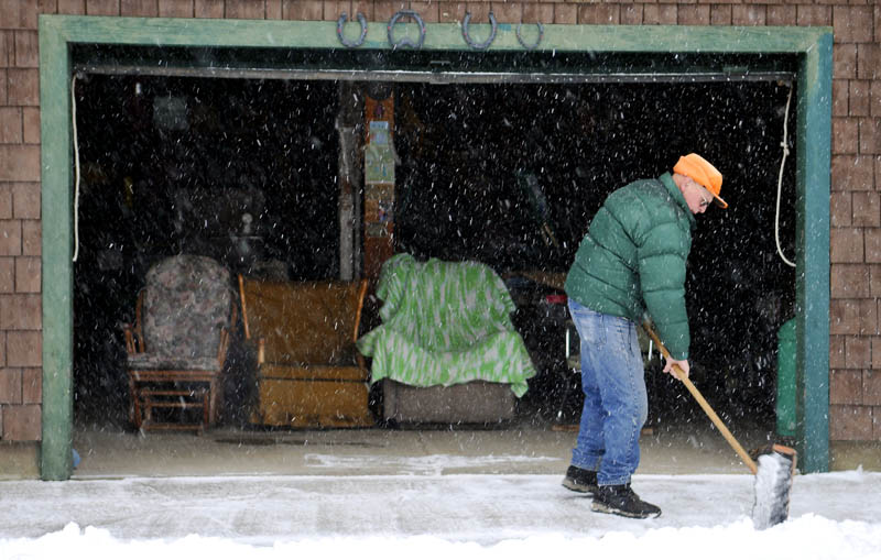 Ernie McPherson battles sleet and snow late afternoon Wednesday while clearing out around his Farmingdale home. McPherson, 85, said he was cutting paths with a broom where his plow couldn’t reach, near the barn where he holds court with his son, Ned, and several nephews.
