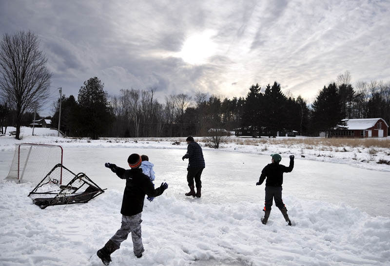 Boys pelt Mike Flynn, center, with snowballs on Sunday, on the ice at Lily Pond in West Gardiner. The ice that Flynn was cleaning off with a shovel was too rough for hockey, so the kids resorted to plugging him with snow.