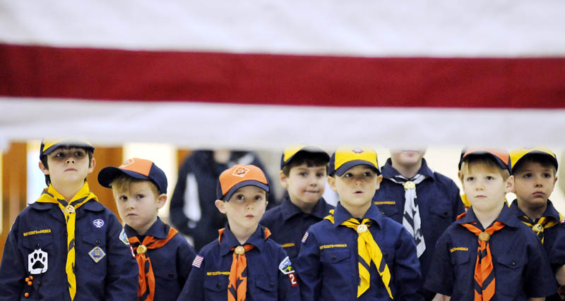 Members of Cub Scout Pack 222, of Palermo, observe soliders with the Maine Army National Guard’s Maine Military Funeral Honors Program folding the U.S. flag Tuesday, at the Augusta State Armory. After watching the soldiers present the colors, the Scouts practiced proper flag etiquette under the supervision of the Guardsmen, who provide honor burials for veterans.