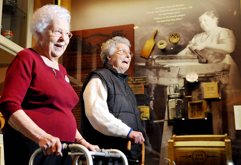 Jeanne Chamberland, left, 88, of St. Agatha and her sister, Lillian Bussier, 84, of Lewiston, laugh after viewing a photo Friday of their mother, Emma Gagnon, pouring buttermilk. The photo, captured by Farm Security Administration photographer John Collier Jr. while documenting the Gagnon family’s potato farm in Frenchville, is on display at the Maine State Museum in Augusta. Gagnon, a mother of 11 children, passed away from tetanus at the age of 42, two years after the photo was created. It was the first time Chamberland saw the photo.