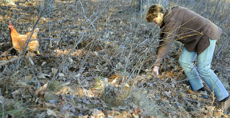 Myra Macfie herds a hen away from the road outside her Hallowell home on Wednesday. Macfie has nine free-range hens which provide her eggs, and a bantam rooster that sat in a lawn chair and crowed as Macfie rounded up the miscreant flock.