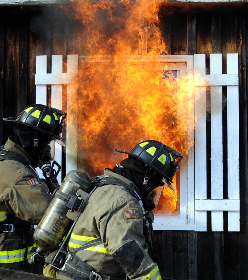 Firefighters walk past a burning window Sunday during a controlled burn of a donated home and barn at the Kelley Bros. Farm in Pittston. Dozens of firefighters from communities in Lincoln and Kennebec County practiced extinguishing blazes and rescuing trapped people during the exercise, Pittston Fire Chief Jason Farris said.