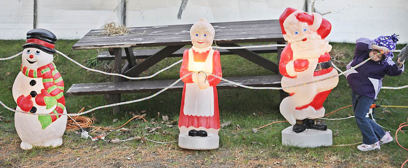 Jules Wing, 4, ducks under a string of holiday lights Tuesday while helping her grandparents, Margaret and Leroy Harrington, decorate their Manchester home. The family exchanged cornstalks placed around the home for Christmas figurines.