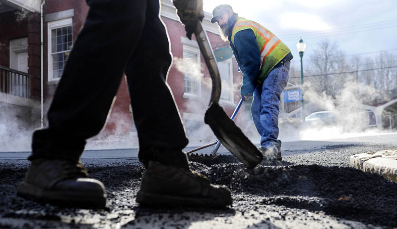 Ferraiolo Construction Co. workers Mark Megill, right, and Dave Buzzell spread pavement Monday on Church Street in Gardiner. The road received a new layer ahead of winter, as temperatures hovered below freezing.
