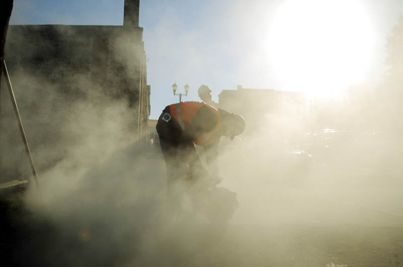 Nathan Breault cuts a sidewalk on Water Street in Augusta on Tuesday, beneath clear-blue skies. Crews from S.E. MacMillan Co. were repairing a piece of the walkway that had been removed to upgrade the city’s sewer and stormwater system.