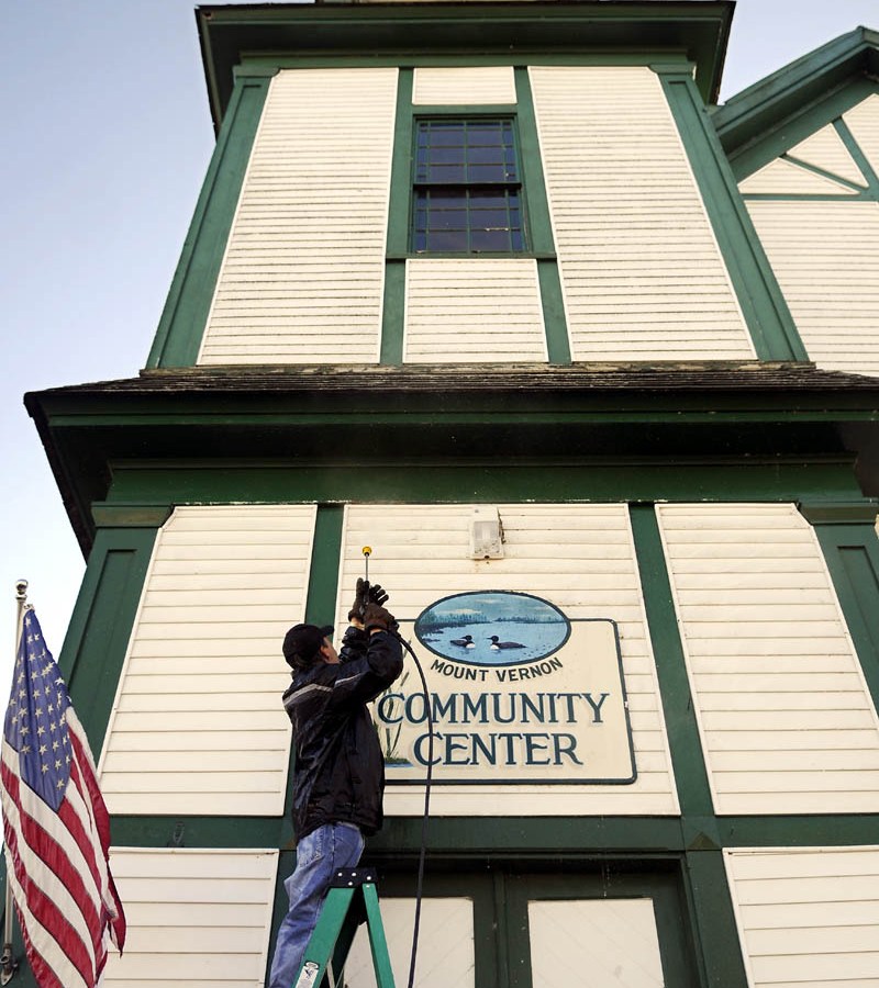 Darrell Trask, of Vienna, sprays the exterior Wednesday of the Mount Vernon Community Center, on the shores of Minnehonk Lake. The proprietor of Sunny Day Cleaning said he was soaked from pressure washing the first level of the decommissioned church which is open for town events. “I’m hurrying up because I’m freezing,” Trask said.