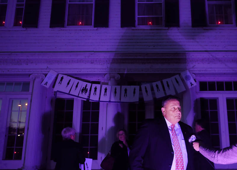 AUGUSTA — Gov. Paul LePage discusses domestic violence Monday during a lighting ceremony at the Blaine House in Augusta. A purple light will bathe the governor’s official residence for a month to raise awareness about domestic violence in addition to 40 candles that will be kept lit in the windows.