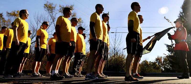 Wardens stand at attention as District Game Warden Kris Barboza, right, hangs a pennant Wednesday to a flag carried by the Wardens during the annual Fallen Officer Memorial Run.