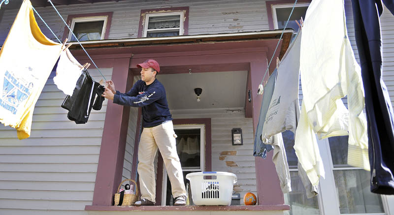 Gil Coryell hangs the laundry Sunday between his home and garage in Augusta. Coryell said his family uses the all-natural drying system for clothes until it gets too cold.