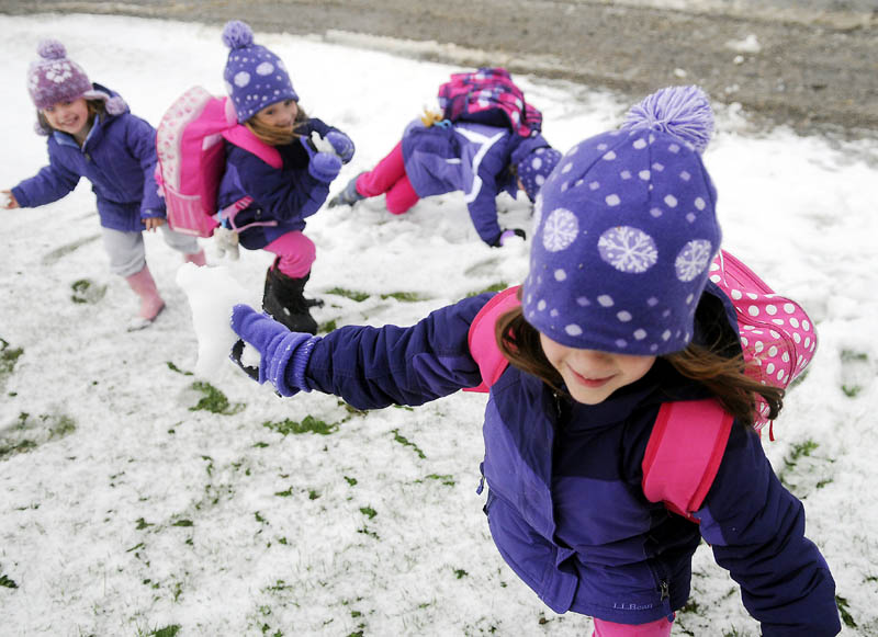 Abby Perry, 5, winds up to deliver a snowball Thursday while brawling with her twin sister, Emma, second from left, and cousins, Marinn Perry, 4, left, and Grace Perry, 6, at their grandparents’ Hallowell farm. The children were waiting for a bus to deliver them to school that was delayed two hours by the first snowfall of the season.