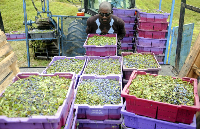 Ed Merilorme, of Waterville, stacks crates of blueberries he helped harvest Sunday with a tractor at a barren in Dresden. Commercial pickers are moving across Maine this week to pick the fruit as the season commences.
