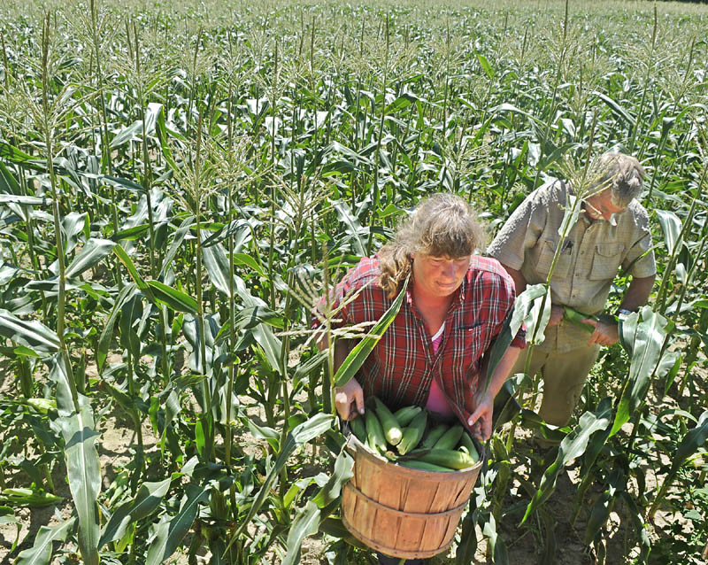 SAME PRICE: Wendy Elvin carries a basket of sweet corn that she harvested Tuesday with her father, Elmer, in a field at the family’s Readfield farm.
