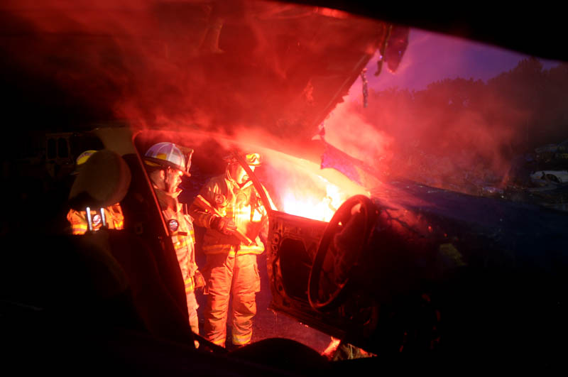 TRAINING EXERCISE: Manchester firefighters light a flare Wednesday night before igniting a car at Clark’s Cars & Parts in Hallowell. Firefighters from Manchester and Hallowell practiced extrication techniques on two vehicles before extinguishing a blaze in a third vehicle during a joint training exercise. Clark’s donated the cars.