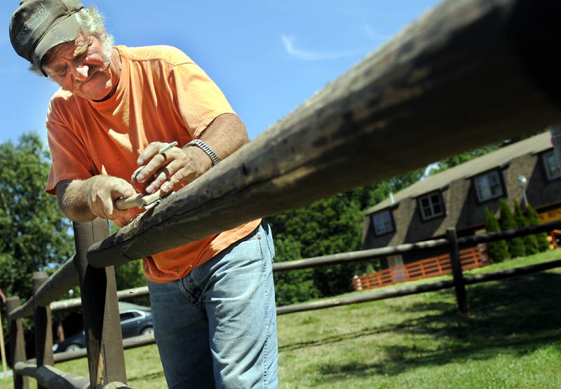 STRIP IT: Roy Twist, of Mount Vernon, strips paint Monday from a pole fence in Farmingdale. “If it weren’t for the breeze, it would be stifling,” Twist said.