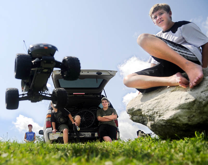 Michael Shaw, 15, left, Robert Shaw, 13, Ken Cagle, 15, and Chris Shaw, 14, watch a remote control truck they operated Monday take a jump at Williams Playground in Augusta. The boys claim the electric vehicle can reach speeds of up to 30 miles per hour and climb rocks.
