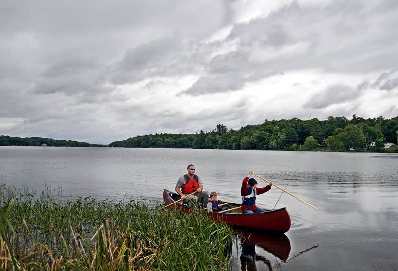 Jake, right, 9, Parker, 5, and Scott MacMaster row back to shore Wednesday after fishing on Pleasant Pond in Litchfield. Jake caught three yellow perch, Parker caught five yellow perch and their father’s got away when the elder MacMaster dropped his fishing pole on the pond.
