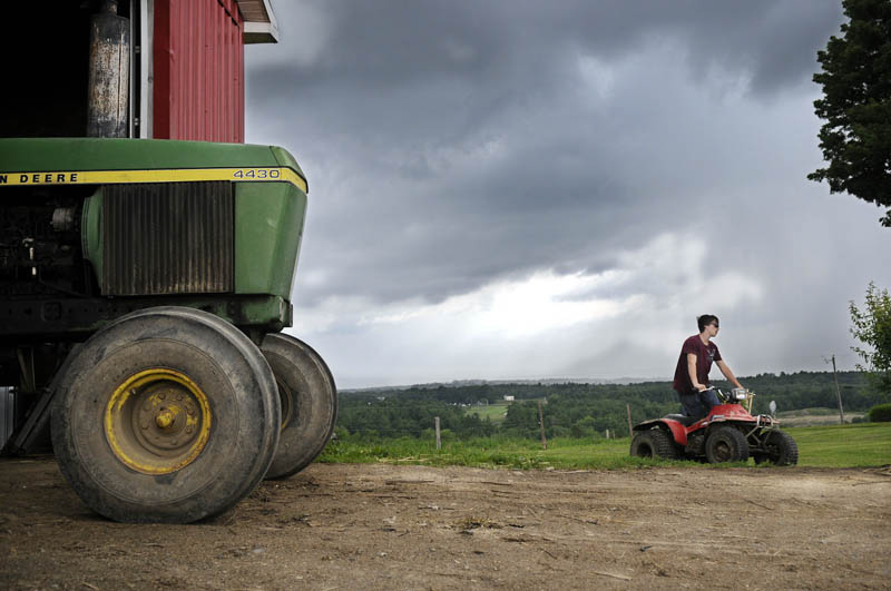 Zack Dionne, 15, drives his all-terrain vehicle to cover Monday at the Fisher Farm in Vassalboro ahead of an approaching thunderstorm. Dionne, of Vassalboro, had been tending the first crop of spring hay with the John Deere tractor at the dairy farm, which has 190 cows. Farmhands said they hoped to resume cutting and baling […]