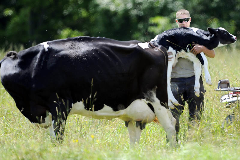 Farmhand Mike Christie lugs a freshly born bull calf Monday from a pasture at the Roseberry Farm in Richmond. Joe and Paul Roseberry milk 69 head at the organic dairy where about 70 calves have been born over the last year. The baby bull was moved to a pen for shelter.