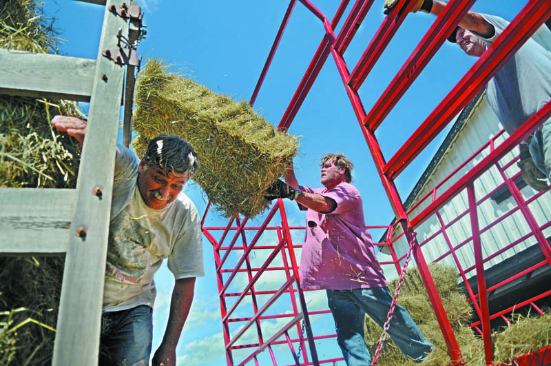 Duane Whitten, center, tosses a square bale of hay Sunday over the head of his brother, Dwight, left, while loading a trailer belonging to Wayne Lewis, right. Lewis, of Chesterville, collected a 100 bales of fresh hay from the Manchester farm belonging to Maynard Whitten, Dwight’s and Duane’s father.