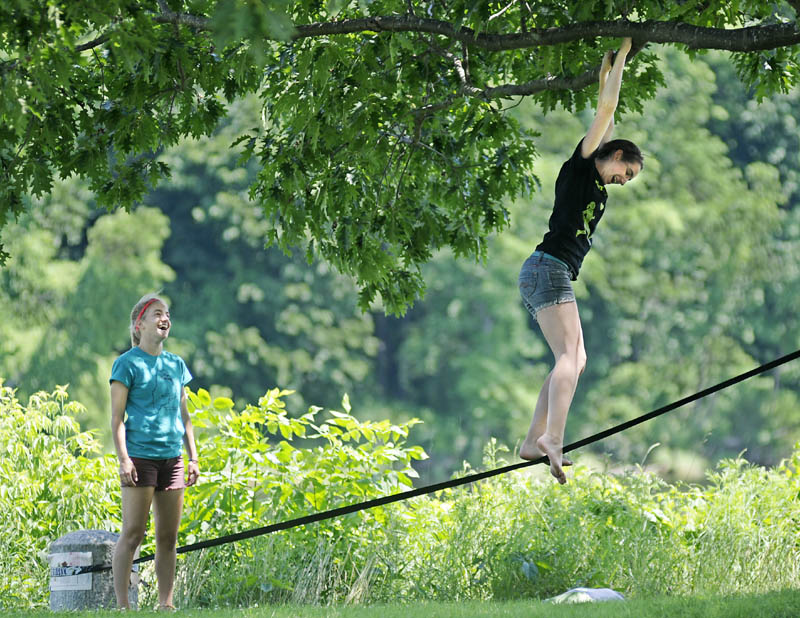 Laura MacDonald, 17, of Hallowell, reaches out for a tree limb Tuesday while balancing on a slack line at the Hallowell boat landing with her buddy, Lara Blum, 17, of Waterville. The duo each received a slack line for their birthdays in April, according to MacDonald, and have been perfecting their technique since.