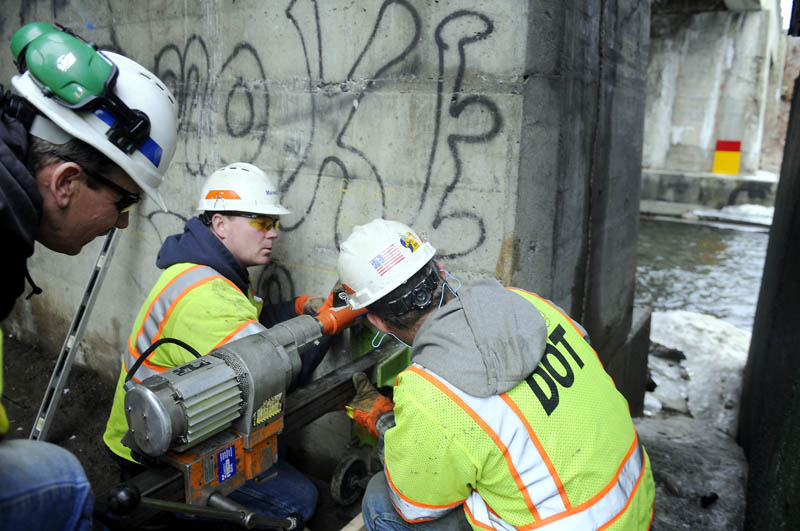 BORE THE BRIDGE: Maine Department of Transportation workers, from left, George James, Eric Moody and Keith Bates, level a drill Wednesday to bore a hole through a bridge column suspending the span across Cobbossee Stream in Gardiner. State crews have commenced work at repairing the concrete columns beneath Bridge Street and expect to be under […]