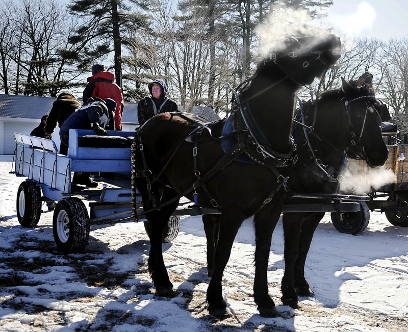 People dismount a sleigh Sunday after being towed around the Windsor Fairgrounds during the Windsor Historical Society’s annual sleigh rally. Several teams of horses and a pack of sled dogs gave rides in sub-zero temperatures around the Fairgrounds during the annual event.