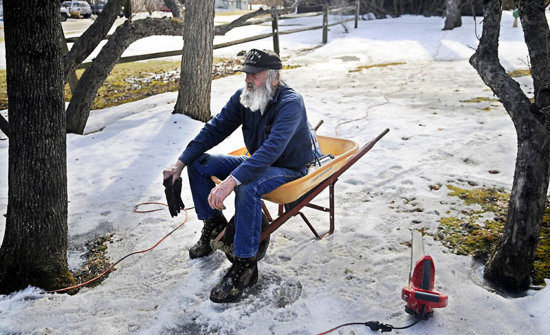 Bill Phinney stays comfortable Thursday in his wheelbarrow while monitoring a brush fire outside his home in Litchfield. Phinney said the mild weather encouraged him to kindle the burn pile in his yard. “I just love it,” he said of the February thaw.