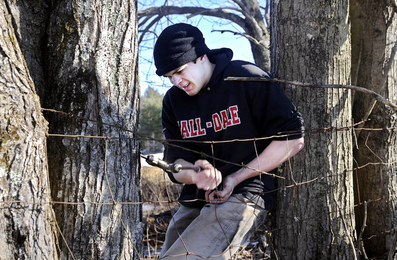Steve Longfellow, 16, taps a Maple tree Monday at his family’s Farmingdale farm. Longfellow said it was early for the sap to run in the sugar bush but “it’s been a little warm in the afternoon” this February.