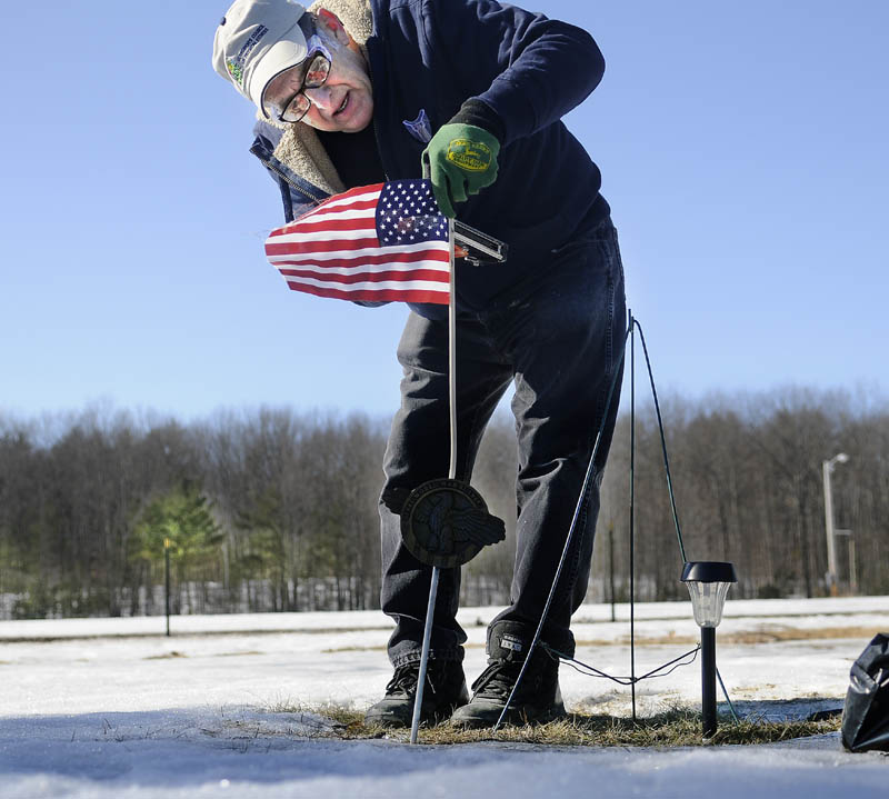 Don Suittor, of West Gardiner, staples the American flag Sunday to a pole adorning the Litchfield cemetery plot of his parents, Gilbert and Martha Suittor. His father, a World War II veteran, and mother “loved me unconditionally,” Suittor said.