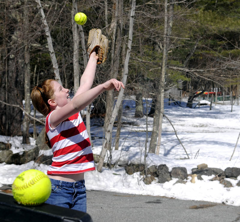 Morgan Morrow, 10, can’t collect a pass from her father, Dave, outside their Readfield home Sunday. The Morrow family was practicing for the upcoming softball season that the girls play and father coaches.