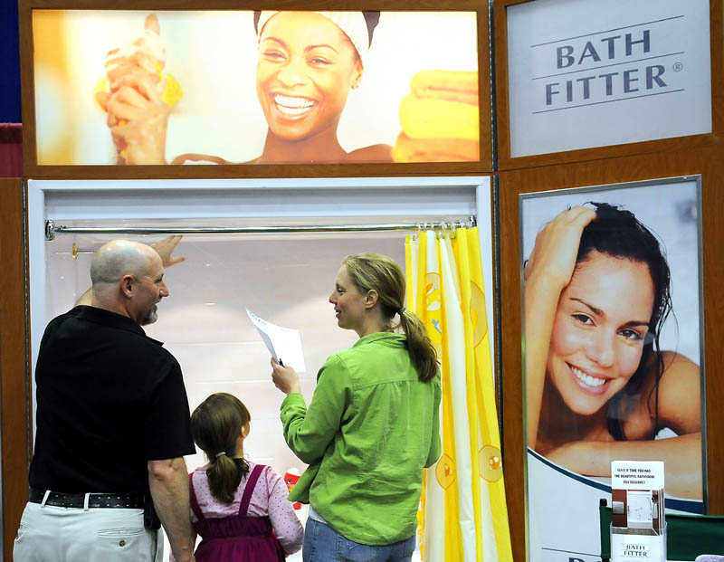 Bath Fitter salesman Rick Gauthier speaks with Jessica Argraves, right, and her daughter, Amber, during the Manchester Lions Club Home & Garden Show at the Augusta Civic Center. The 38th annual show was a success, according to Manchester Lions officer Mike Ponti, with “good turnout” during the weekend.